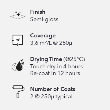 A two-pack high chemical resistant, high build amine cured novolac epoxy paint, that provides a high film thickness with one coat. Designed to be used as a tank-lining solution for potable water, solid and liquid foods and a wide range of chemicals.